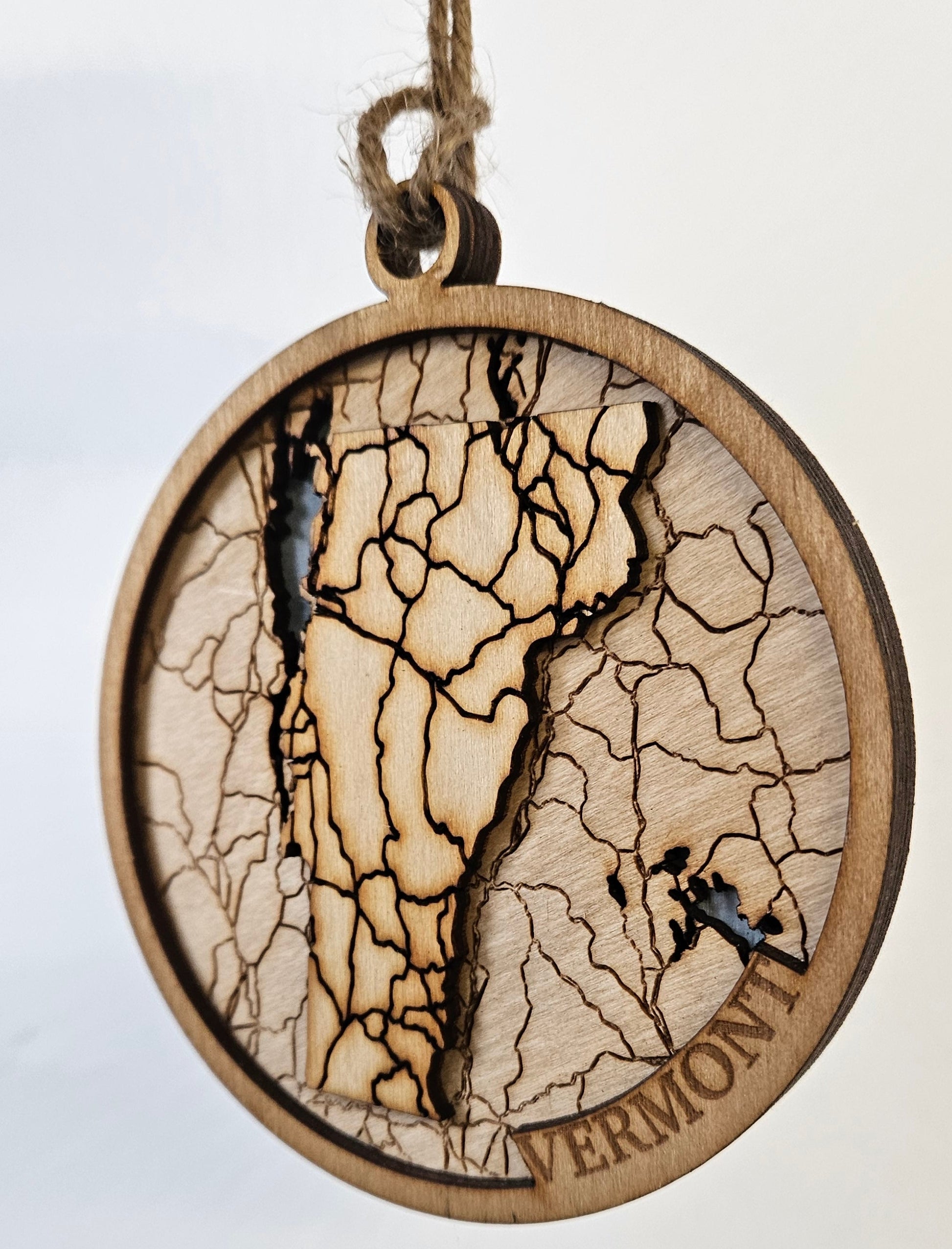 Show your love for the Green Mountain State with this handcrafted Vermont 3D Topography Ornament. Laser-cut from premium birch wood, this ornament highlights Vermont’s full road network, state borders, and layered elevation, creating a realistic raised relief design that stands out from flat map art. Each layer is stained and assembled by hand to bring out depth and contrast, giving Vermont’s terrain a sculpted, dimensional look that captures the character of the entire state.